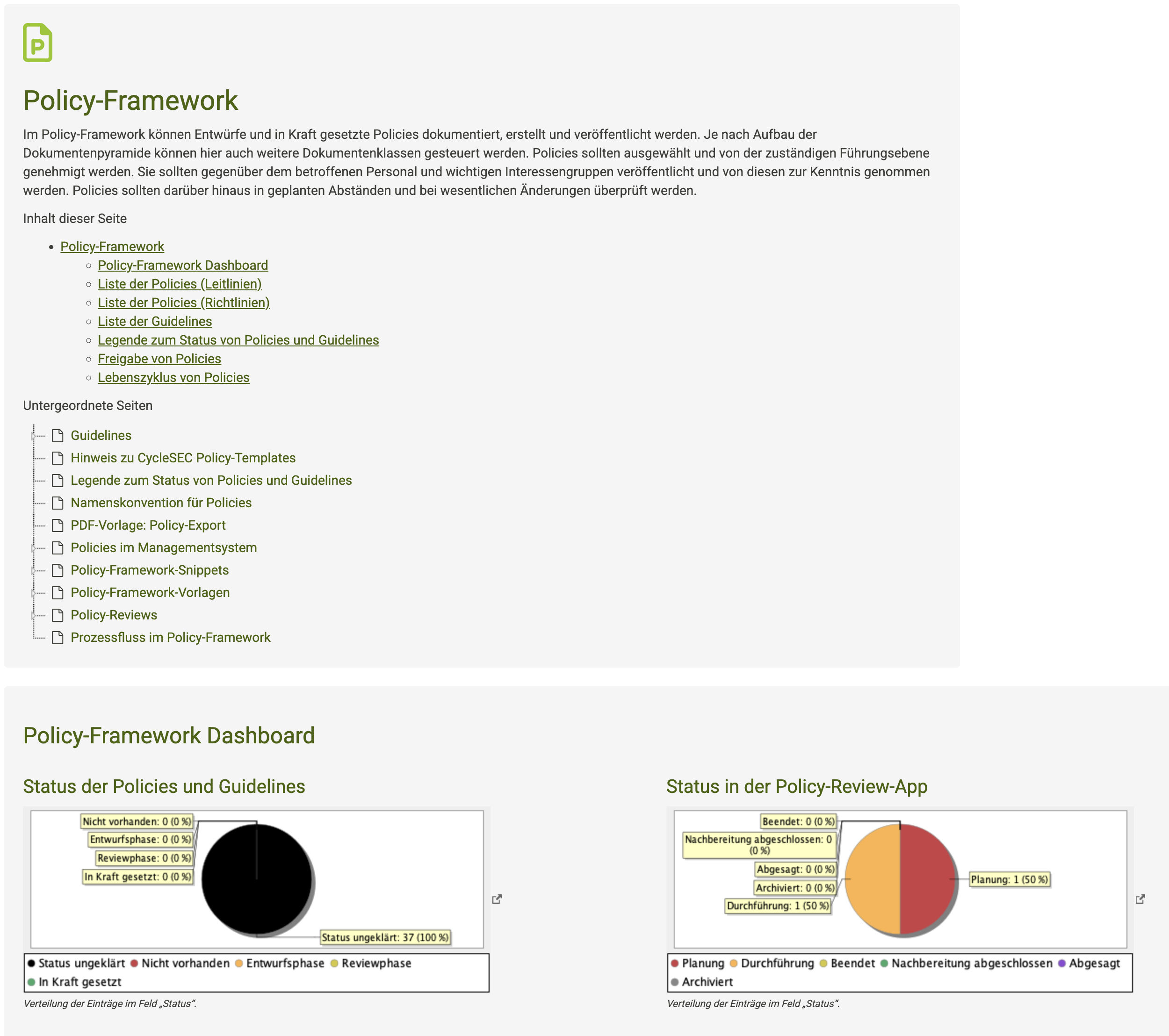 - Grafische Auswertung: Der Status von Policies und Policy-Reviews wird grafisch ausgewertet.