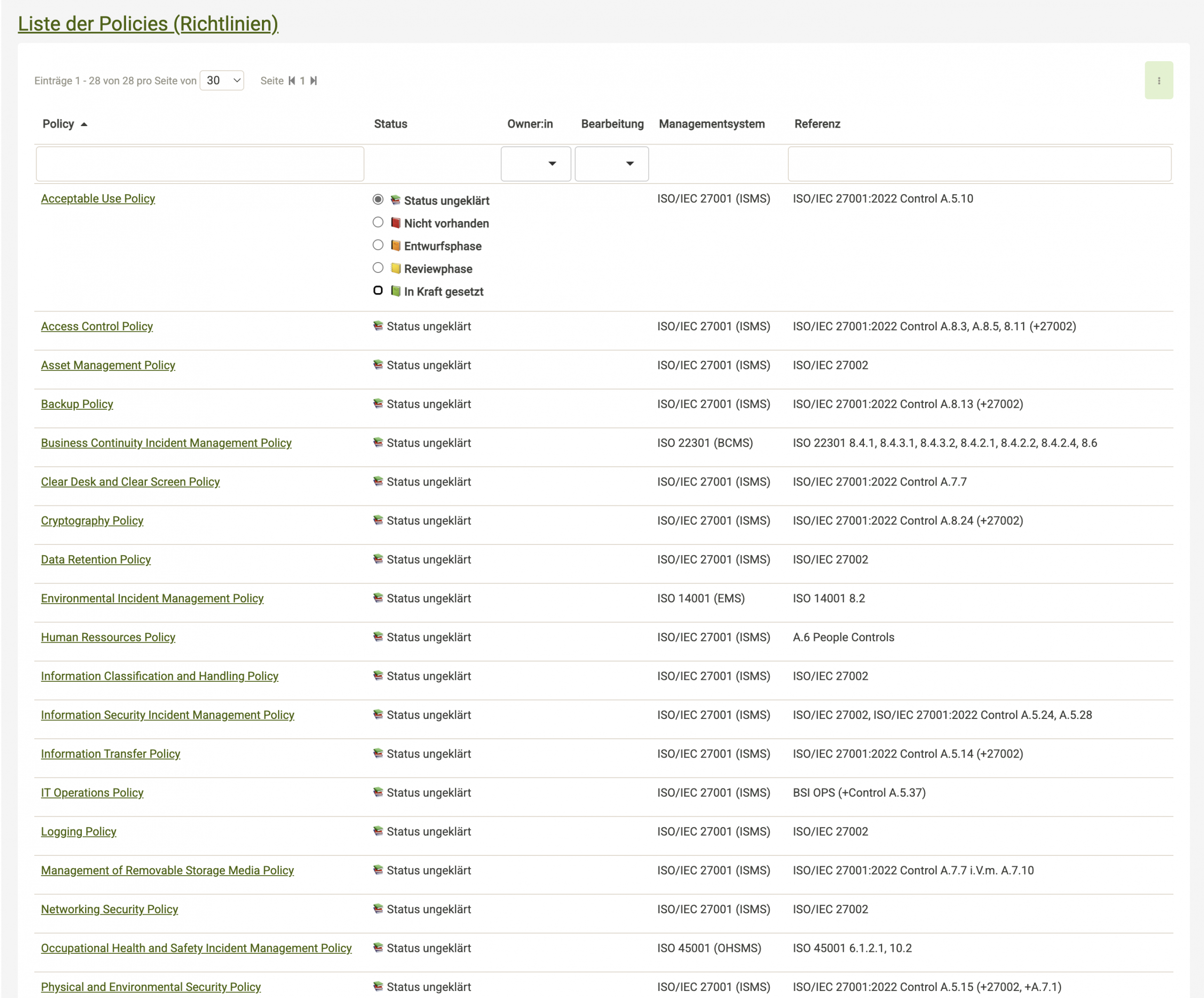 - Übersichtlichkeit: Einheitliche Darstellung aller Aktivitäten im Lebenszyklus von Policies und Guidelines.