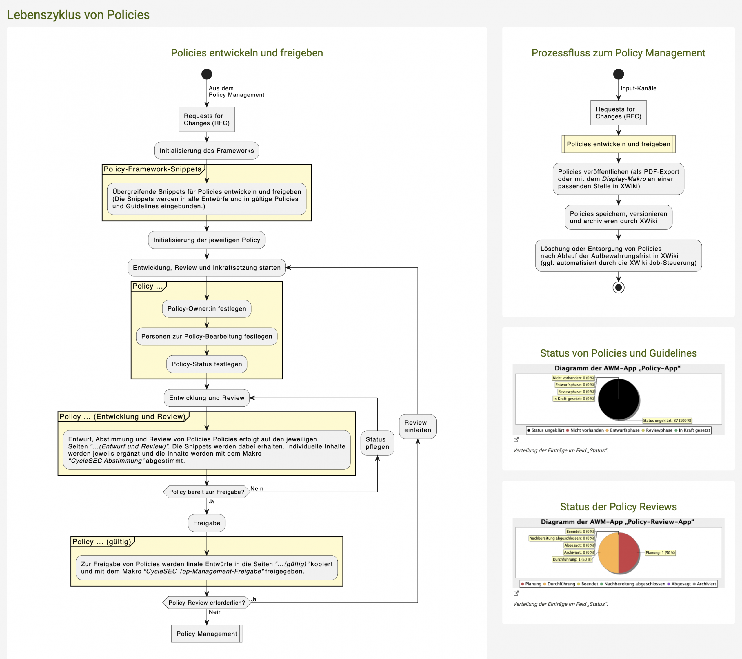 Dieses XWiki-Archiv umfasst über 150 vorkonfigurierte XWiki-Seiten mit sechs automatisch aktualisierten Tabellen, bis zu zehn App-Diagrammen, zwei Prozessdiagrammen, mehreren spezialisierten Makros sowie zwei AWM-Apps zur Steuerung Ihrer Policies und Policy-Reviews.