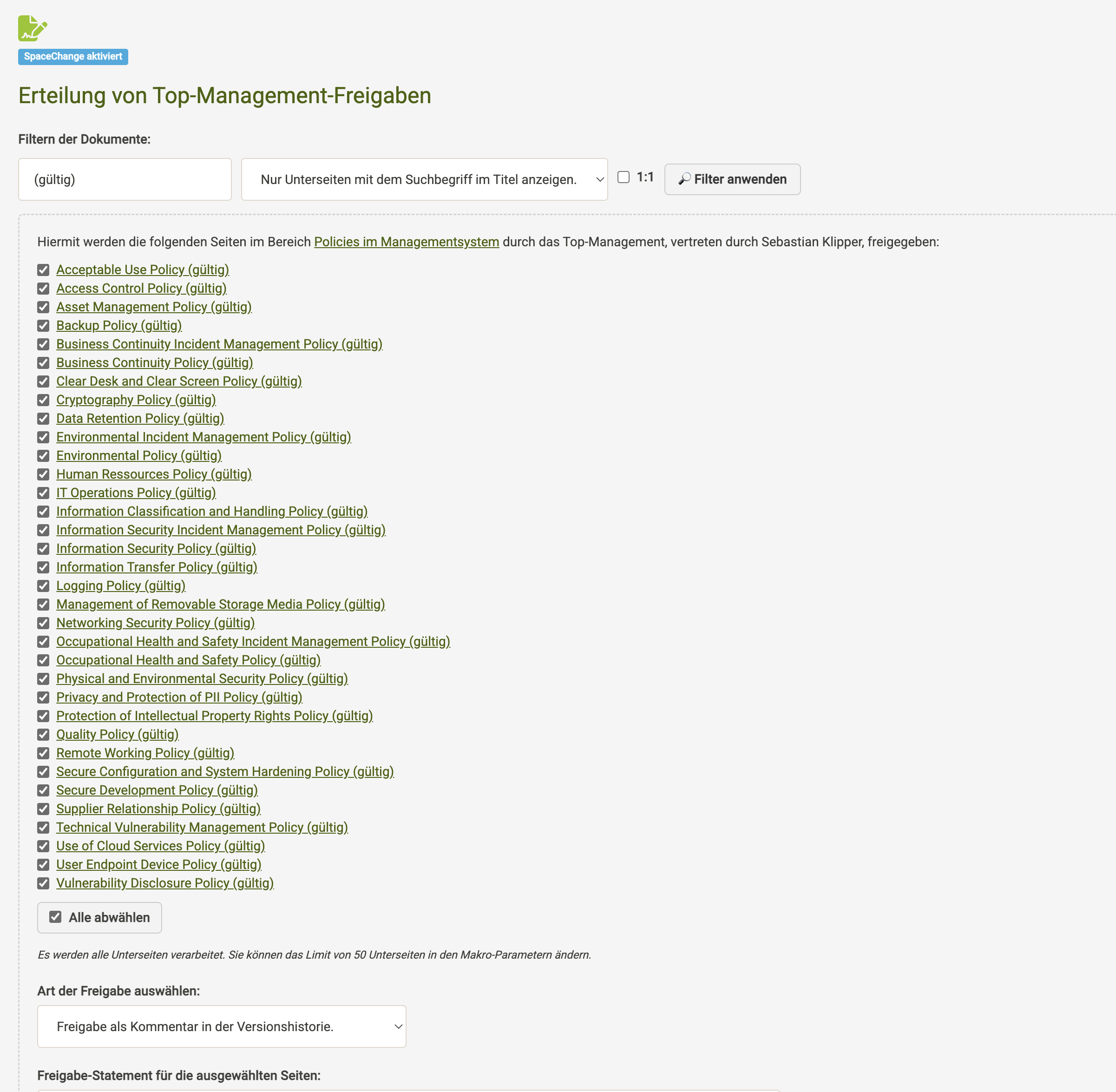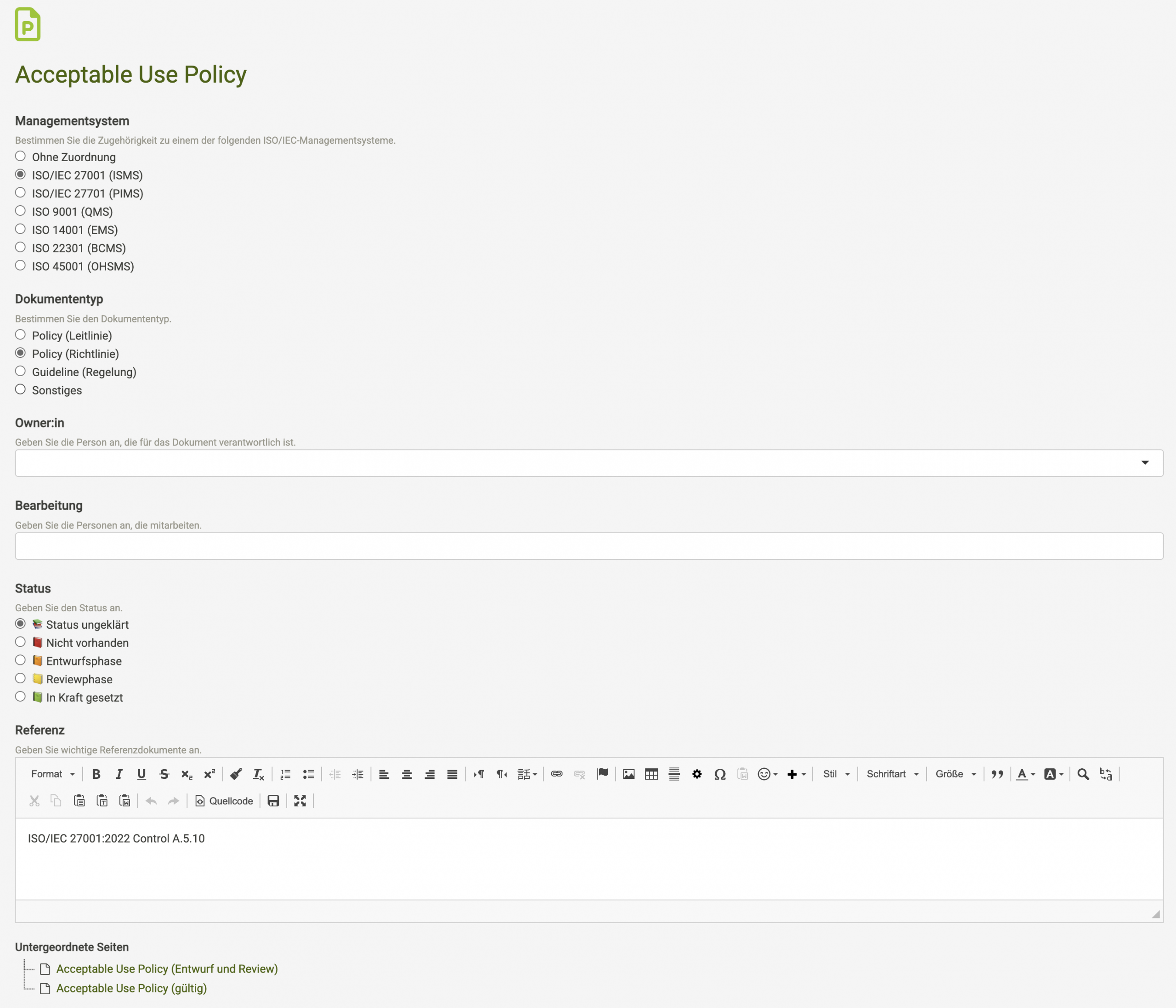 - Fast 40 vorbereitete Dokumentationsvorlagen: Unterseiten für die wichtigsten Policies und Guidelines zu folgenden ISO/IEC-Normen:
