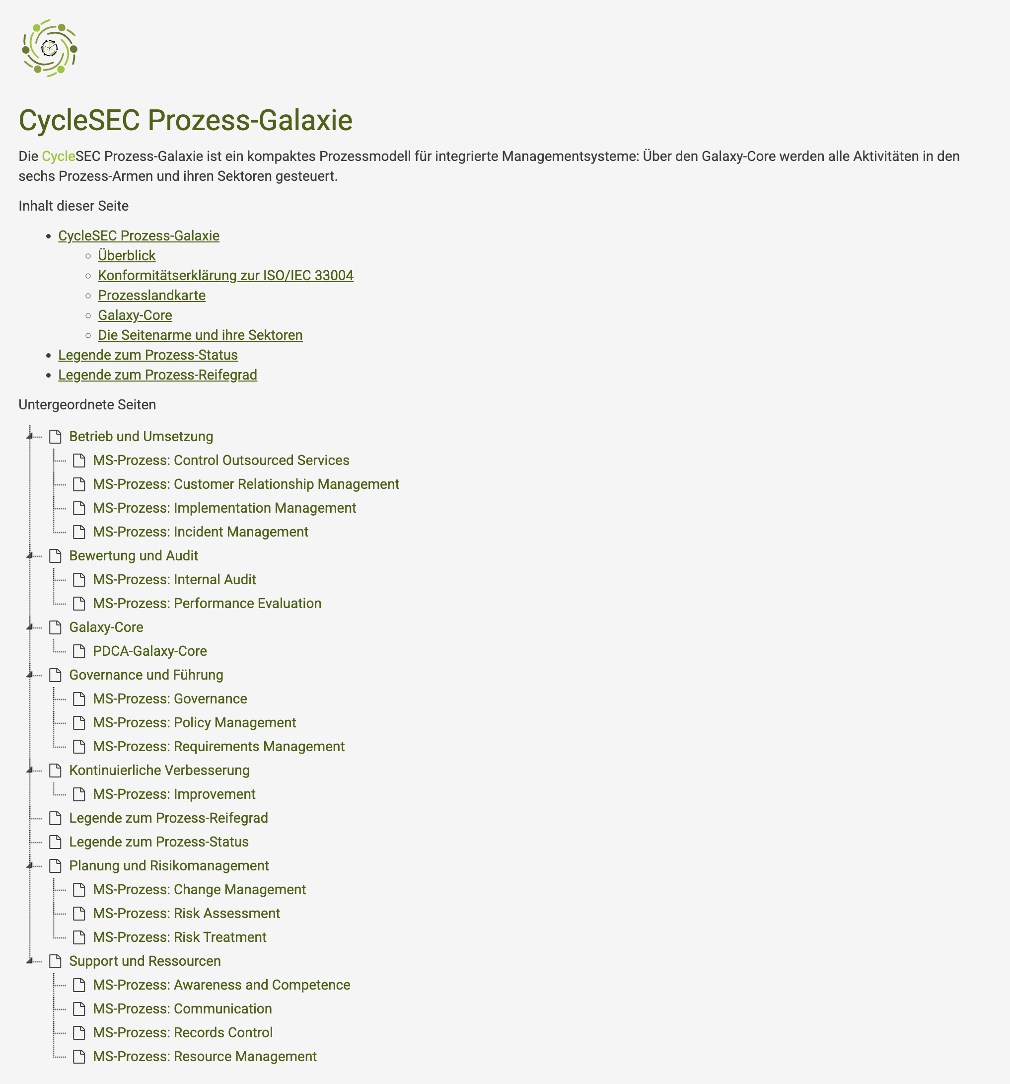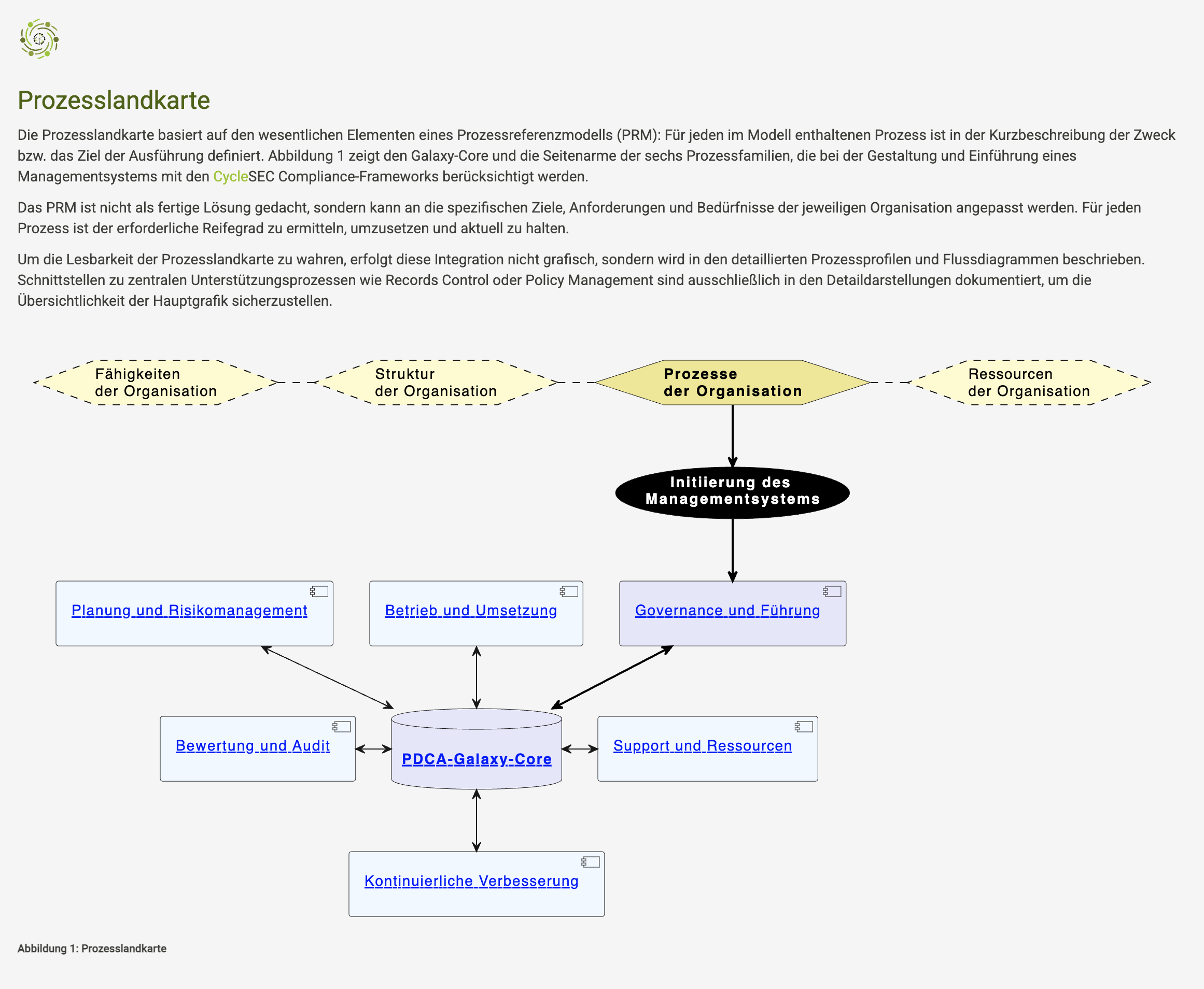 Die CycleSEC Prozess-Galaxie ist ein kompaktes Prozessmodell zur Organisation und Steuerung aller Plan-Do-Check-Act-Aktivitäten in Ihren integrierten Managementsystemen. Dieses XWiki-Archiv besteht aus einer Prozesslandkarte aus 18 Prozesssteckbriefen. Für jeden im Modell enthaltenen Prozess ist in der Kurzbeschreibung der Zweck bzw. das Ziel der Ausführung definiert. Die Prozesse können nach dem enthaltenen Reifegradmodell bewertet werden.