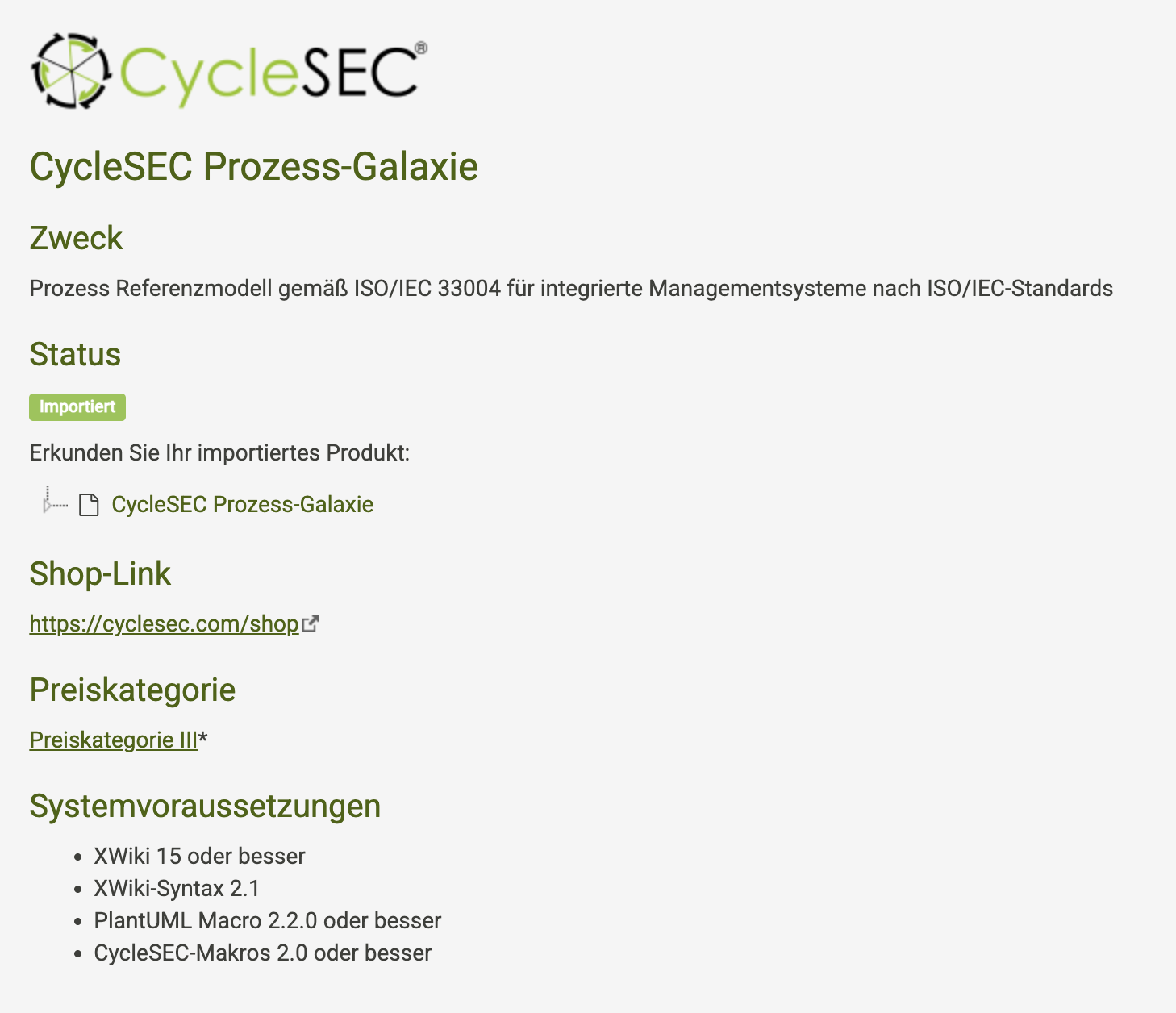 | Systemvorausetzungen | CycleSEC-Makros 2.0 oder besser, PlantUML Macro 2.2.0 oder besser, XWiki 15 oder besser, XWiki-Syntax 2.1 |