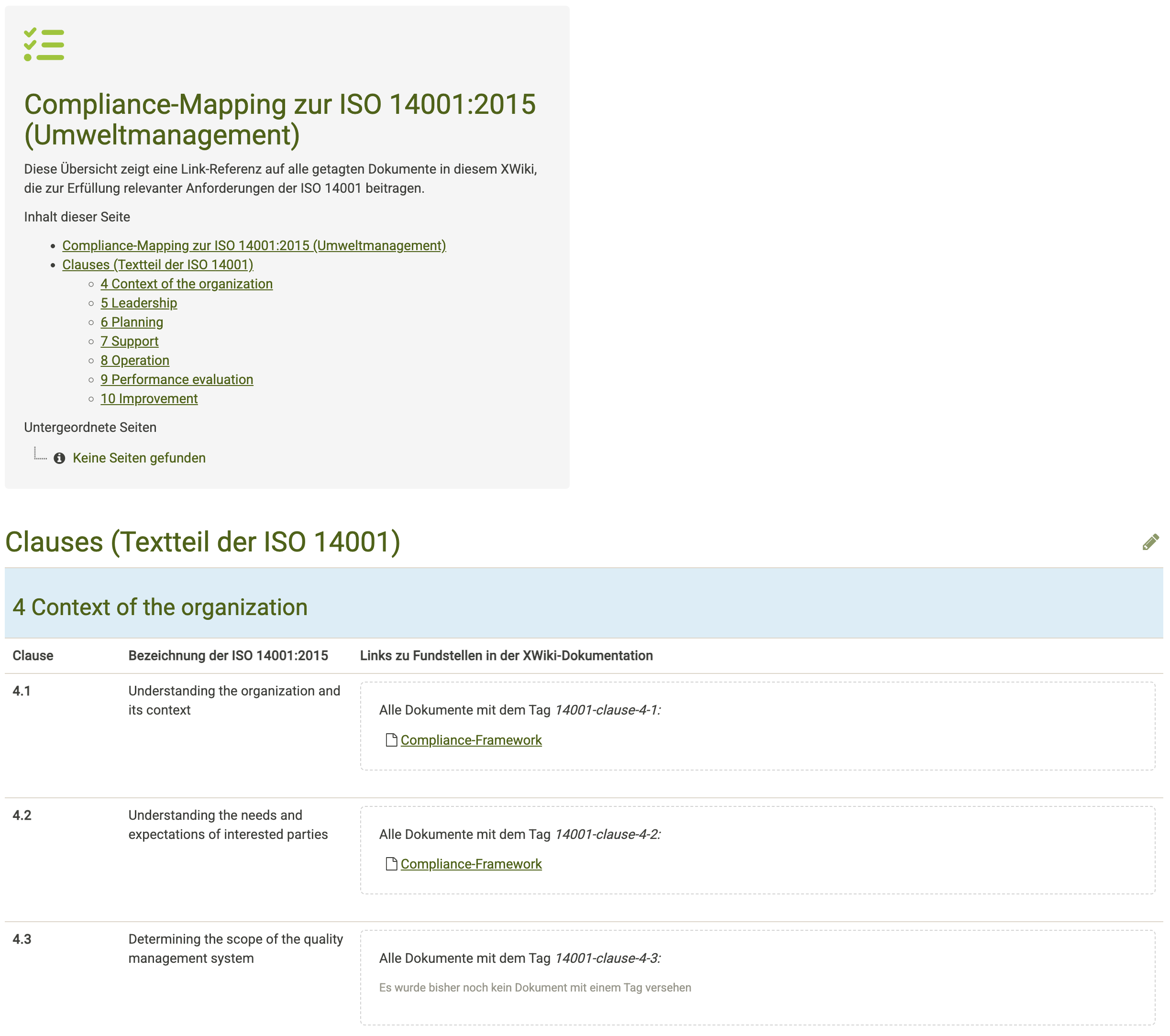 Das EMS-Compliance-Mapping leistet einen wichtigen Beitrag zur Erfüllung der Anforderungen nach ISO 14001:2015. Es unterstützt bei der Dokumentation relevanter Anforderungen und stellt eine direkte Referenz zwischen diesen Anforderungen und den Fundstellen in Ihrem XWiki-System her. Taggen Sie alle Seiten, die zur Erfüllung relevanter Anforderungen beitragen, und bauen Sie so eine jederzeit aktuelle Referenzliste für Ihr EMS auf.
