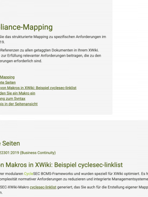 Die in diesem Archiv enthaltenen Mappings zum IT-Grundschutz-Kompendium zeigen für jeden Baustein und jede Anforderung entsprechend getaggte Seiten im XWiki-System als Linkliste an. Der CycleSEC IT-Grundschutz-Mapping-Generator stellt zusätzlich für jeden Baustein Copy-and-Paste-Vorlagen zur Einbindung der Anforderungen sowie passende Seitentags bereit, um das Tagging der XWiki-Seiten zu erleichtern.